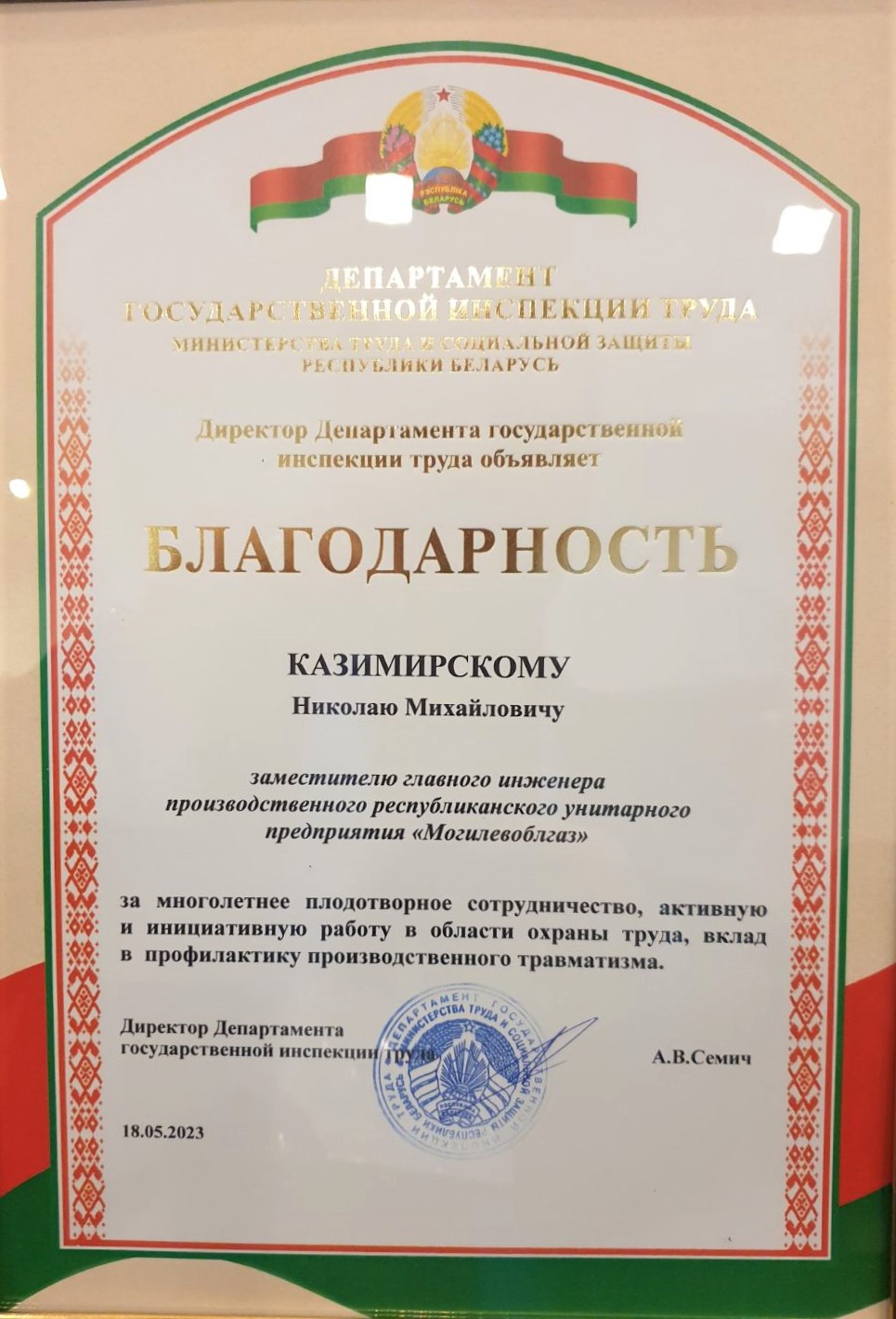 Заместителю главного инженера РУП «Могилевоблгаз» Николаю Михайловичу Казимирскому объявлена Благодарность Департамента государственной инспекции труда за многолетнее плодотворное сотрудничество, активную и инициативную работу в области охраны труда, вклад в профилактику производственного травматизма.