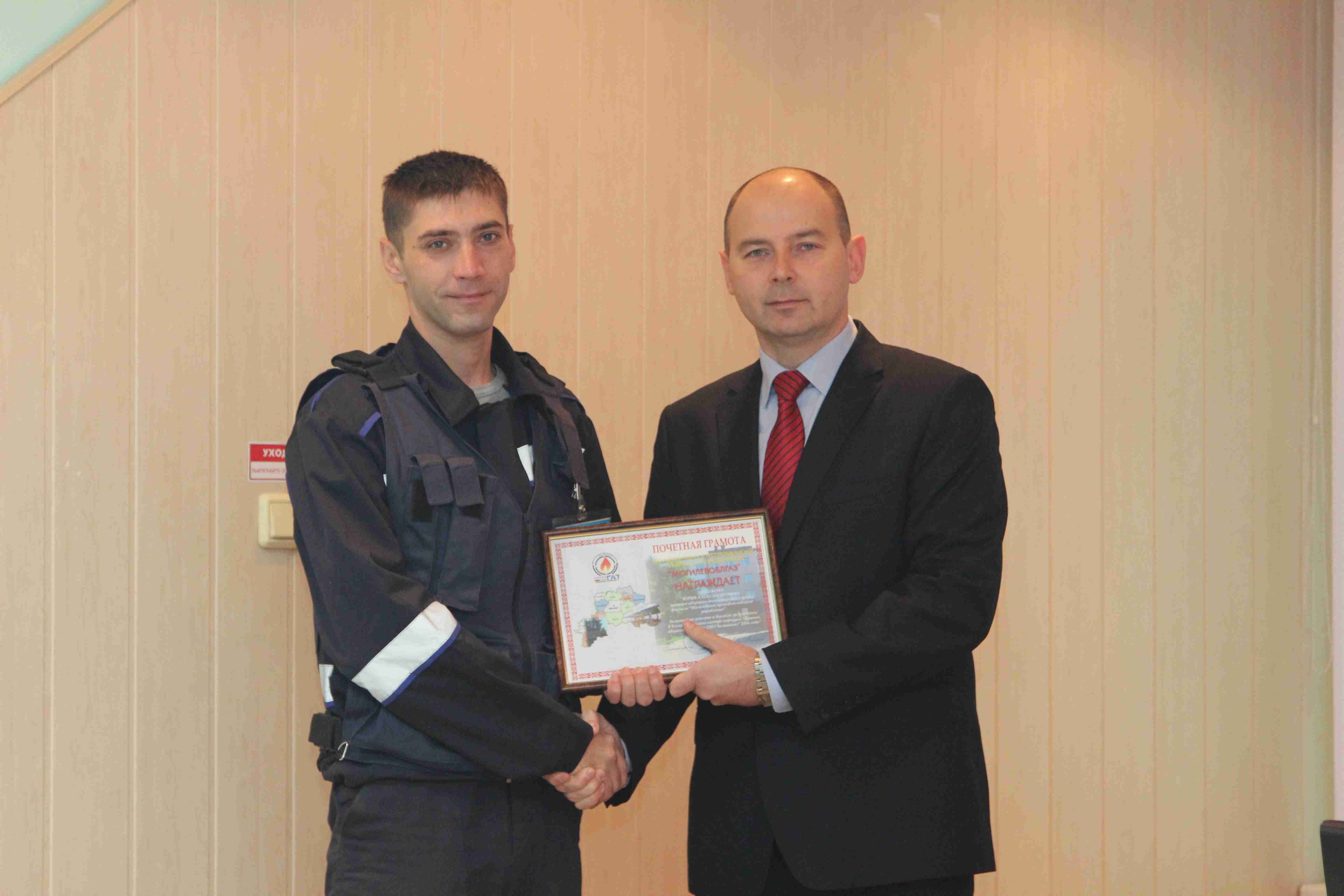 10 октября в торжественной обстановке генеральный директор РУП «Могилевоблгаз» Кушнаренко А.И. поздравил команду ПУ «Могилевгаз» с высоким достигнутым результатом и вручил почетные грамоты предприятия членам аварийной бригады: мастеру АДС Лащакову Ю.А., слесарю аварийно-восстановительных работ в области газоснабжения Башаримову В.В., водителю автомобиля Кравцову В.И., а также объявлена благодарность предприятия работникам, принимавшие активное участие в подготовке бригады к конкурсу – начальнику ТИ Казимирскому Н.М., главному инженеру ПУ «Могилевгаз» Степанову А.В., начальнику АДС ПУ «Могилевгаз» Рыжикову А.В.