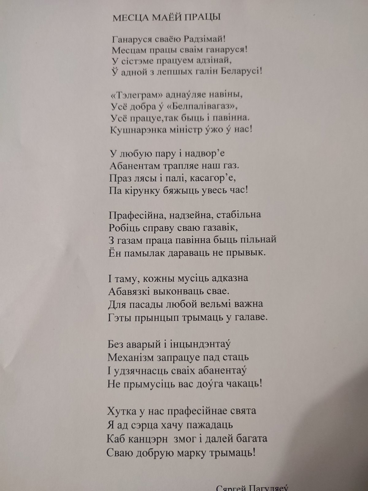 Сергея Погуляева, начальника Хотимского района газоснабжения ПУ «Климовичигаз», в номинации «Стихотворение о профессии» с победой в конкурсе, приуроченном к профессиональному празднику - Дню работников нефтяной, газовой и топливной промышленности.