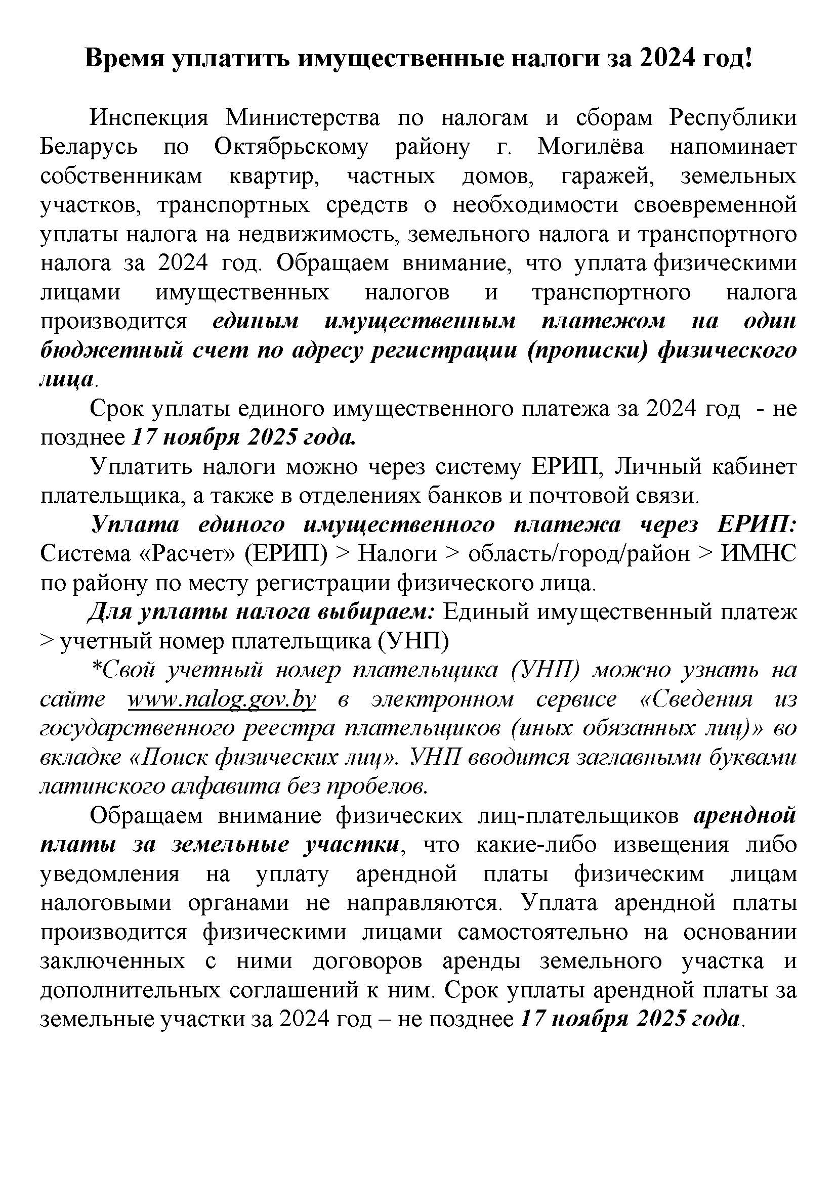 Время уплатить имущественные налоги за 2024 год! Инспекция Министерства по налогам и сборам Республики Беларусь по Октябрьскому району г. Могилёва напоминает собственникам квартир, частных домов, гаражей, земельных участков, транспортных средств о необходимости своевременной уплаты налога на недвижимость, земельного налога и транспортного налога за 2024 год. Обращаем внимание, что уплата физическими лицами имущественных налогов и транспортного налога производится единым имущественным платежом на один бюджетный счет по адресу регистрации (прописки) физического лица.
